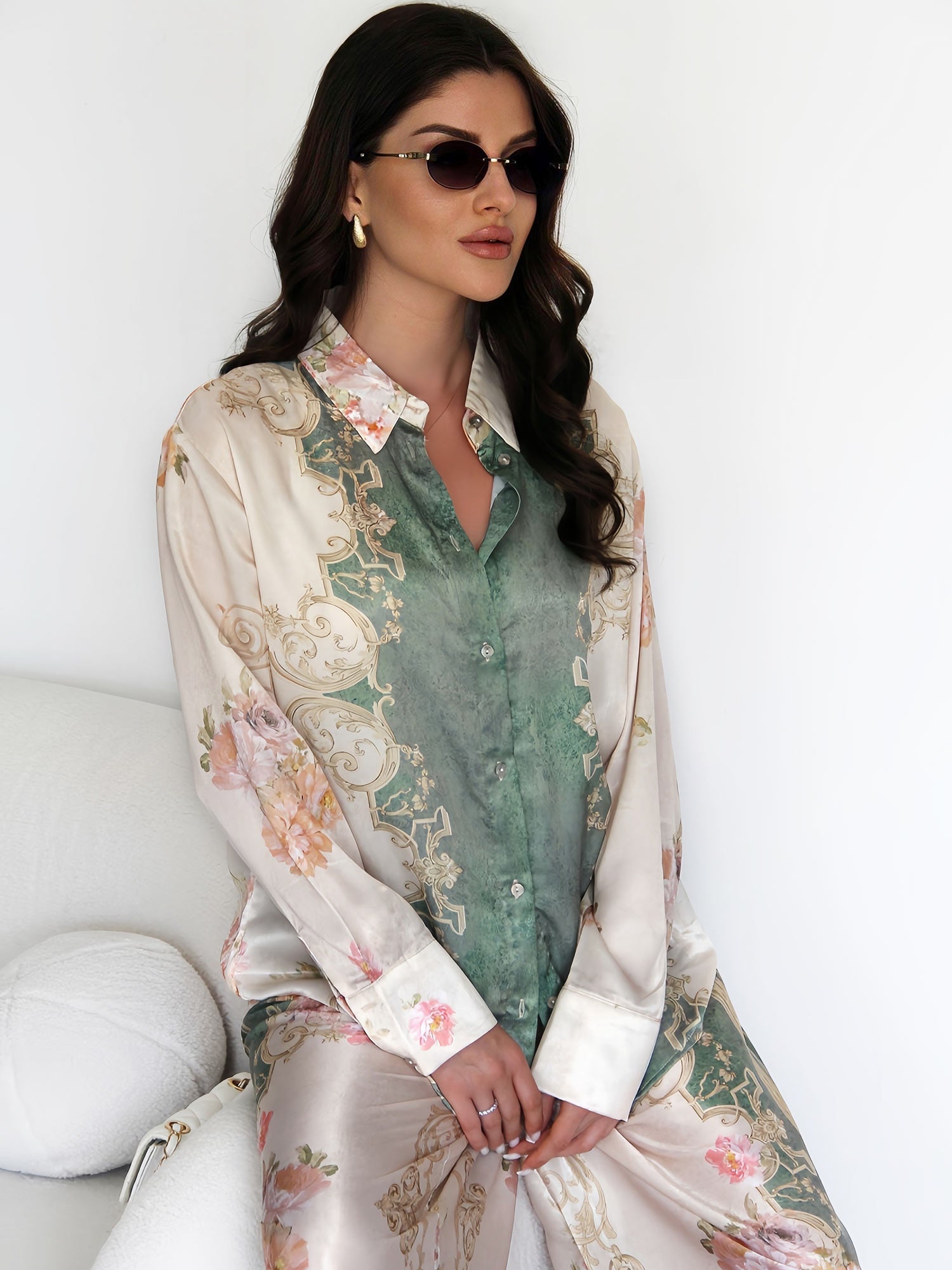 The Baroque Floral Satin Shirt is a masterpiece of vintage-inspired artistry. Its fluid satin fabric, deep V-neck, and relaxed fit exude an air of effortless sophistication. Finished with delicate button details and an ornate floral print, this shirt pairs beautifully with tailored or casual pieces for an elevated look.