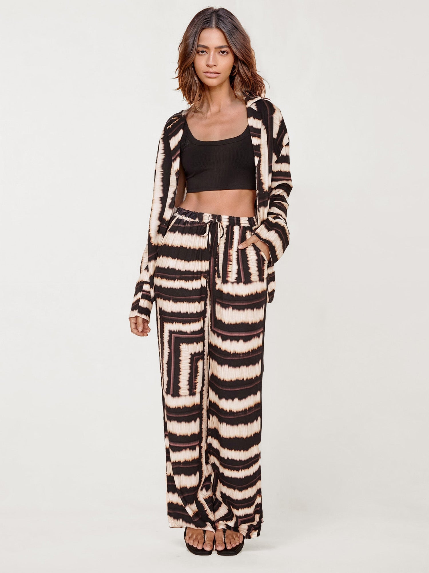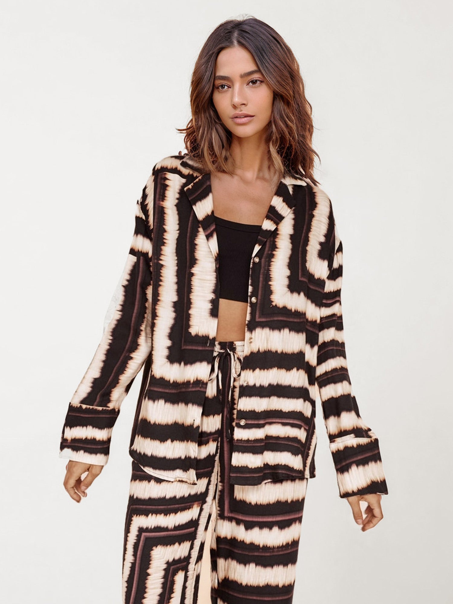 The Boho Tie-Dye Button-Down Shirt brings effortless boho style with its striking black and beige tie-dye pattern. Designed with a relaxed, oversized fit, this shirt is perfect for a casual, chic look. Pair it with the matching pants for a complete boho outfit or wear it open over your favorite top for a beachy vibe.