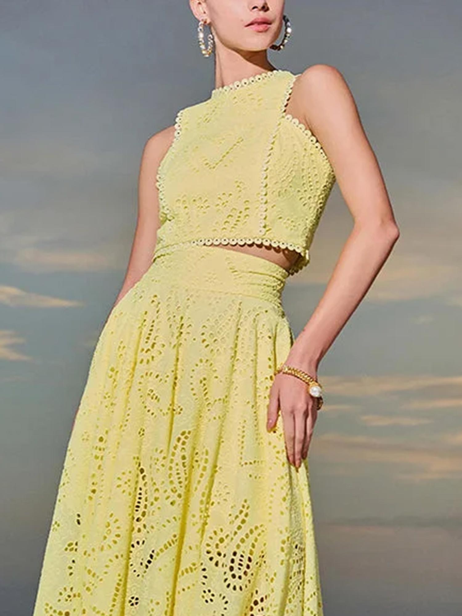 This sleeveless crop top blends modern structure with delicate detail. Featuring intricate eyelet embroidery, a high neckline, and scalloped edges, it offers a fresh, feminine silhouette that's perfect for warm-weather styling. Pair it with the matching skirt for a cohesive set or style it solo for a bold, breezy look.